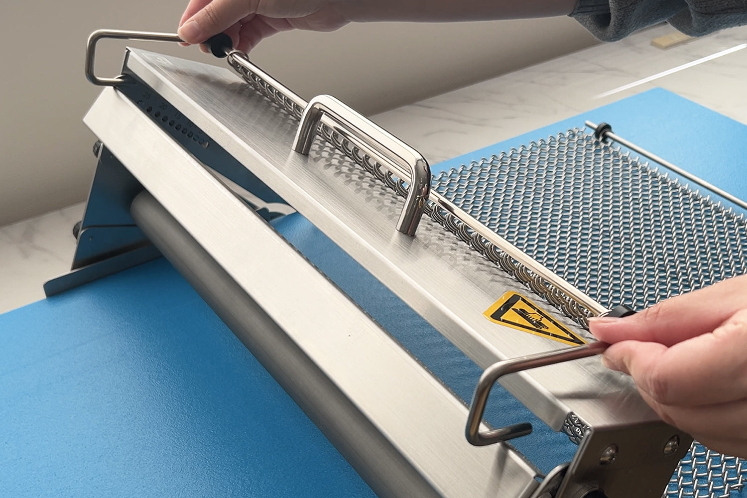 Place the dough on the board and gently rotate the handle to laminate it. The curling chain will then roll the dough into a uniform cylindrical shape in one smooth motion. -