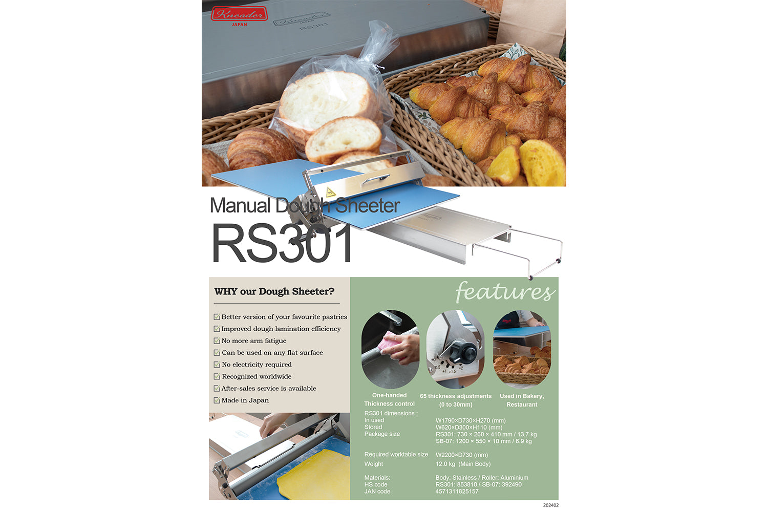 Folding Dough Sheeter RS201, while also suitable for home bakers, is ideal for those who need to handle larger batches. Whether in a home kitchen, café, bakery, or restaurant, it provides even more precise thickness adjustments, giving you greater control over your dough.